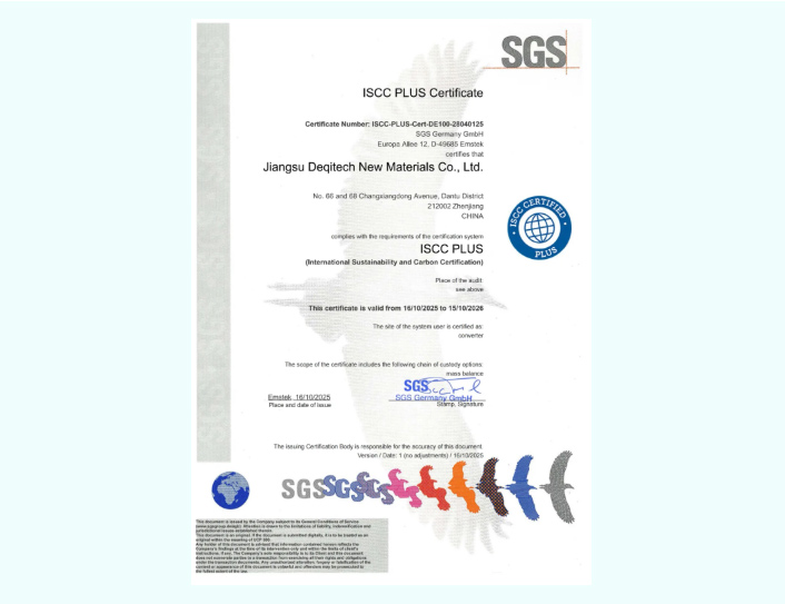 For Jiangsu Deqitech, this ISCC PLUS certificate is far more than a standard document; it is a landmark "badge of honor" in the company's development journey. It signifies that every single step—from raw material sourcing to production—fully complies with top-tier international environmental requirements, social responsibility standards, and full-process traceability norms. The sources of recycled materials withstand sustainability scrutiny, the production process imposes zero burden on the environment, and the transparency across the entire supply chain is clear for all to see.